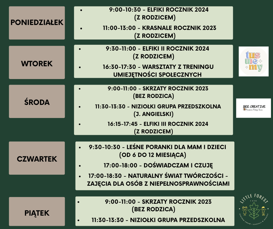 Little Forest 4 Kids to całodzienna opieka i kreatywne zajęcia, które przygotowują dzieci do dalszej drogi przedszkolnej. Tworzymy ciepłą, bezpieczną przestrzeń, w której mali odkrywcy uczą się, rozwijają pasje i budują pewność siebie przez zabawę i doświadczenie